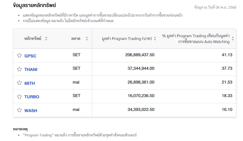 นอกจากนี้ ตลาดหลักทรัพย์แห่งประเทศไทย (ตลท.) รายงานข้อมูลหลักทรัพย์ที่มีการซื้อขายผ่านระบบ Program Trading สูงสุด โดยพิจารณาจากสัดส่วนมูลค่า Program Trading เทียบกับมูลค่าการซื้อขายแบบ Auto Matching พบว่า หลักทรัพย์ที่มีการทำรายการสูงสุดในวันนี้ ได้แก่ GPSC,THANI,88TH,TURBO, WASH