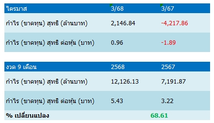TOP เปิดผลประกอบการไตรมาส 3/68 พลิกมีกำไรสุทธิ 2,147 ล้านบาท จากขาดทุน 4,218 ล้านบาทปีก่อน รับอานิสงส์กำไรจากสต๊อกน้ำมัน 1,508 ล้านบาท และกำไรจากการซื้อคืนหุ้นกู้ หนุน EBITDA เพิ่มขึ้นกว่า 8,000 ล้านบาท