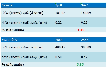 โดยในงวดไตรมาส 3 ปี 2568 มีรายได้จากการขายเพิ่มขึ้น 333.9 ล้านบาท หรือคิดเป็นร้อยละ 16.4 เมื่อเทียบกับช่วงเดียวกันของปีก่อน เนื่องจากราคาขายเฉลี่ยต่อหน่วยปรับตัวเพิ่มขึ้นร้อยละ 8.2 และปริมาณการขายเพิ่มขึ้นร้อยละ 7.6 ส่งผลให้บริษัทมีกำไรขั้นต้นเพิ่มขึ้น 34.3 ล้านบาท หรือร้อยละ 16.7 โดยกำไรสุทธิเพิ่มขึ้น 11.5 ล้านบาท หรือร้อยละ 16.7 จากความต้องการสินค้าที่ขยายตัว ประกอบกับการปรับราคาขายให้สอดคล้องกับต้นทุนวัตถุดิบที่เพิ่มขึ้น