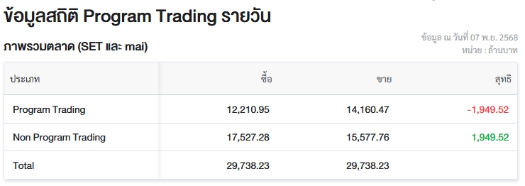 ผู้สื่อข่าวรายงานว่า วันนี้ (7 พ.ย.68) ตลาดหลักทรัพย์แห่งประเทศไทย (ตลท.) เปิดเผยข้อมูลซื้อขายรายวันผ่าน Program Trading หรือ “โปรแกรมโรบอทเทรดดิ้ง” พบว่ามีมูลค่าซื้อจำนวน 12,210.95 ล้านบาท และมูลค่าขายจำนวน 14,160.47 ล้านบาท เท่ากับขายสุทธิ 1,949.52 ล้านบาท