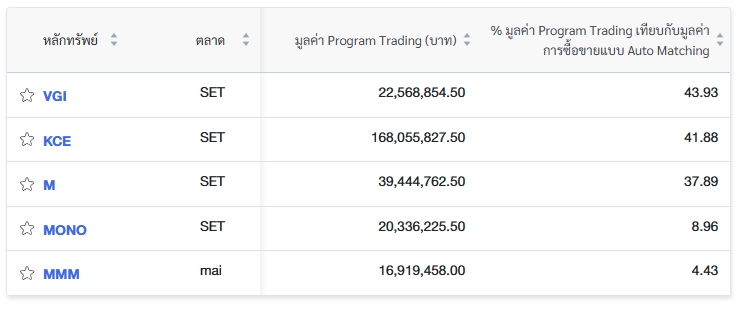 นอกจากนี้ ตลาดหลักทรัพย์แห่งประเทศไทย (ตลท.) รายงานข้อมูลหลักทรัพย์ที่มีการซื้อขายผ่านระบบ Program Trading สูงสุด โดยพิจารณาจากสัดส่วนมูลค่า Program Trading เทียบกับมูลค่าการซื้อขายแบบ Auto Matching พบว่ามี 5 หลักทรัพย์ที่มีการทำรายการสูงสุดในวันนี้ ได้แก่