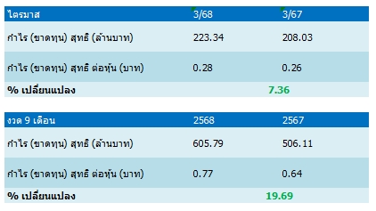 สำหรับไตรมาส 3 ปี 2568 บริษัทฯ มีรายได้รวม 1,384.4 ล้านบาท เพิ่มขึ้น 12.0% จาก 1,235.9 ล้านบาทในช่วงเดียวกันปีก่อน มีกำไรสุทธิ 223.3 ล้านบาท เพิ่มขึ้น 7.4% จาก 208.0 ล้านบาท คิดเป็นอัตรากำไรสุทธิ 16.1% ของรายได้รวม ส่วนงวด 9 เดือนแรกของปี 2568 มีรายได้รวม 3,932.0 ล้านบาท เพิ่มขึ้น 15.2% และมีกำไรสุทธิ 605.8 ล้านบาท เพิ่มขึ้น 19.7% เมื่อเทียบกับช่วงเดียวกันของปีก่อน