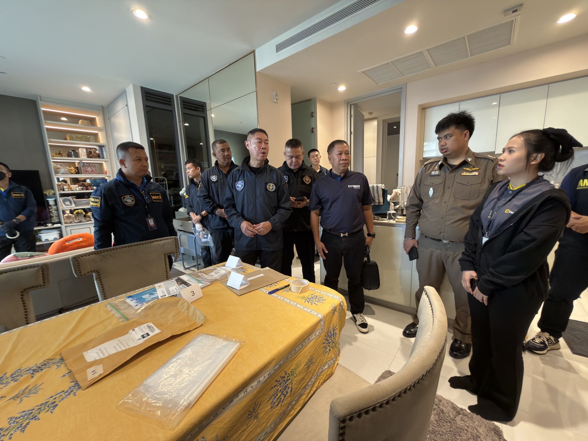 ทั้งนี้ จากการตรวจสอบพื้นที่พบโทรศัพท์มือถือจำนวน 60 เครื่อง และยาเสพติดประเภทที่ 1 (ยาไอซ์) จำนวน 2 ถุง พร้อมจับกุมผู้ต้องหาชาวจีน 4 ราย อายุระหว่าง 21–29 ปี ซึ่งเพิ่งเดินทางมาจากประเทศกัมพูชา เบื้องต้นเจ้าหน้าที่แจ้งข้อหา “ร่วมกันเป็นอั้งยี่, มีส่วนร่วมในองค์กรอาชญากรรมข้ามชาติ และร่วมกันมียาเสพติดให้โทษประเภท 1 (ยาไอซ์) ไว้ในครอบครองโดยไม่ได้รับอนุญาต” ส่วนข้อหาอื่นอยู่ระหว่างการขยายผลเพิ่มเติม