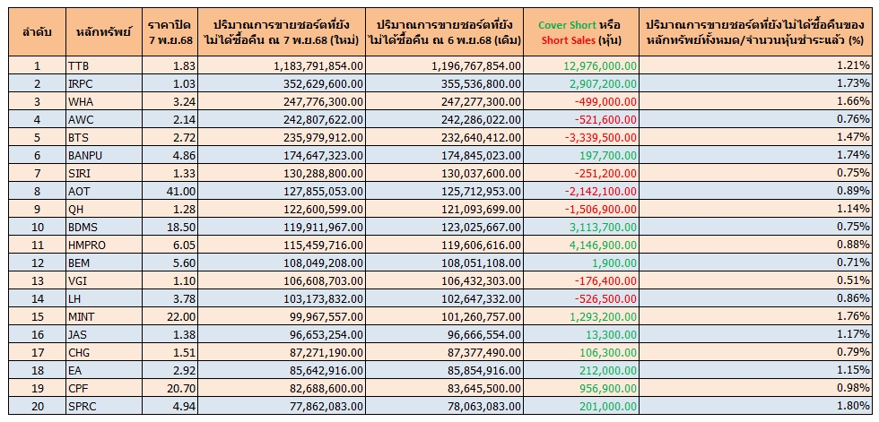 เปิด 20 อันดับหุ้นถูก “Cover-Short” สูงสุด ณ 7 พ.ย.68