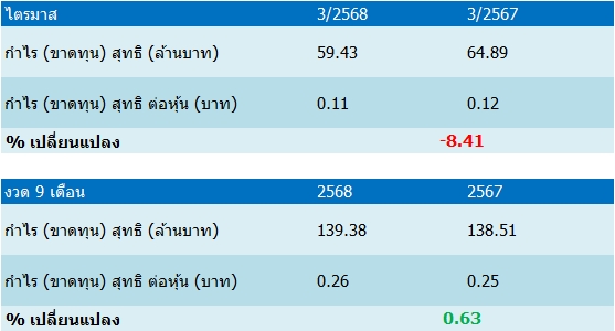 ขณะที่ผลประกอบการงวด 9 เดือนปี 68 มีกำไรสุทธิ 139.38 ล้านบาท เพิ่มขึ้น 0.63% เมื่อเทียบกับงวดเดียวกันของปีก่อนมีกำไรสุทธิ 138.51 ล้านบาท