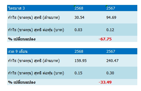 โดยไตรมาส 3/68 มีกำไรลดลงเนื่องจากกลุ่มบริษัทฯรายงานรายได้รวมของโตรมาส 3 ปี 2568 อยู่ที่ 81.27 ลดลงจากจากไตรมาลเดียวกันของปีก่อน 21% ทั้งนี้ในส่วงรายได้รายได้รวมสำหรับ 9 เดือนแรกของปี 2568 อยู่ที่ 587.99 ล้านบาพ ปรับตัวลดลงจากช่วงเดียวกันปีก่อน 8%