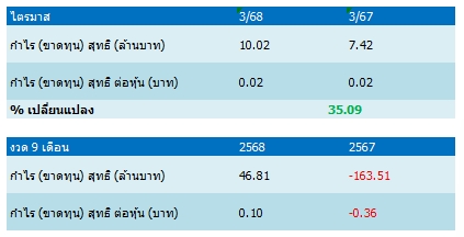 โดยผลการดำเนินงานไตรมาส 3 ปี 2568 โดยมีรายได้จากการขายจำนวน 145.18 ล้านบาท ลดลง 26.91 ล้านบาท หรือร้อยละ 15.64 เมื่อเทียบกับช่วงเดียวกันของปี 2567 สาเหตุหลักมาจากการปรับคำสั่งซื้อของลูกค้าให้สอดคล้องกับสภาวะตลาดที่เปลี่ยนแปลงอย่างรวดเร็ว