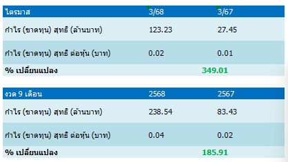 โดยผลการดำเนินงานงวดไตรมาส 3 บริษัทมีกำไรสุทธิ 123.23 ล้านบาท เพิ่มขึ้น 52.18 ล้านบาท หรือคิดเป็นร้อยละ 73.45 จากไตรมาสก่อน และเพิ่มขึ้น 95.78 ล้านบาท หรือร้อยละ 348.98 จากช่วงเดียวกันของปีก่อน