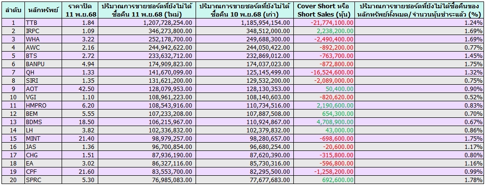 เปิด 20 อันดับหุ้นถูก “Cover-Short” สูงสุด ณ 11 พ.ย.68