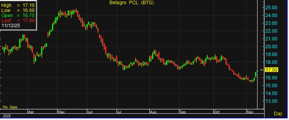 ด้านบริษัทหลักทรัพย์ ฟิลลิป (ประเทศไทย) จำกัด (มหาชน) ระบุว่า แนะนำ “ซื้อ” หุ้น BTG ราคาพื้นฐาน 17.30 บาทต่อหุ้น โดยมองว่าราคาหมูได้ผ่านจุดต่ำสุดในเดือนกันยายนไปแล้ว และเริ่มเห็นการฟื้นตัวตั้งแต่ช่วงต้นเดือนพฤศจิกายนที่ผ่านมา ซึ่งได้รับปัจจัยสนับสนุนจาก 1.นโยบายช่วยพยุงราคาหมูจากสมาคมผู้เลี้ยงสุกร, 2.ปัญหาขาดแคลนแรงงานคลี่คลายลง และ 3.นโยบายกระตุ้นเศรษฐกิจของภาครัฐหนุนกำลังซื้อภายในประเทศ โดยคาดผลการดําเนินงานในไตรมาส 4/2568 จะเติบโตทั้งจากไตรมาสก่อน และช่วงเดียวกันของปีก่อน