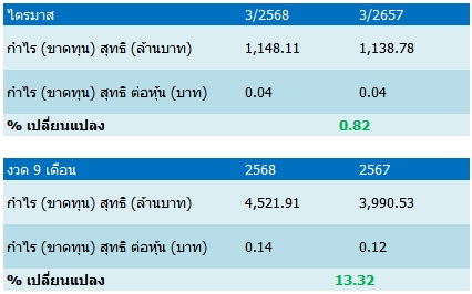 บริษัท แอสเสท เวิรด์ คอร์ป จำกัด (มหาชน) หรือ AWC รายงานผลการดำเนินงานงวดไตรมาส 3/2568 และงวด 9 เดือนแรกของปี สิ้นสุดวันที่ 30 กันยายน 2568 มีกำไรสุทธิเพิ่มขึ้น ดังนี้