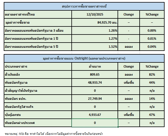 “บลจ.-ประกัน-ต่างชาติ” กวาดซื้อตราสารหนี้ไทย 4.37 พันล้านบาท ส่วน Yield พันธบัตรอายุ 5 ปี ปิดที่ 1.52% ปรับตัวลดลงจากเมื่อวาน -0.04%