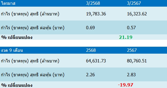 ขณะที่งวด 9 เดือนปี 68 มีกำไรสุทธิอยู่ที่ 64,631.73 ล้านบาท ลดลง 19.97% เมื่อเทียบกับงวดเดียวกันของปีก่อนมีกำไรสุทธิ 80,760.51 ล้านบาท