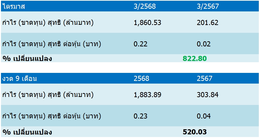 ขณะที่ผลประกอบการงวด 9 เดือนปี 68 มีกำไรสุทธิอยู่ที่ 1,883.89 ล้านบาท เพิ่มขึ้น 520.03% เมื่อเทียบกับงวดเดียวกันของปีก่อนมีกำไรสุทธิ 303.84 ล้านบาท