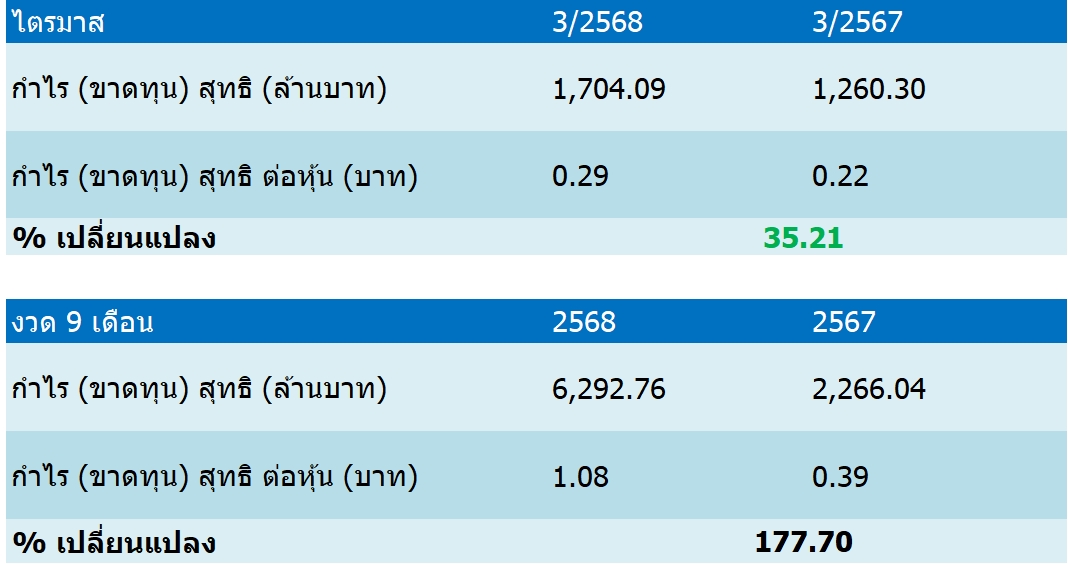 ขณะที่ผลประกอบการงวด 9 เดือนปี 68 มีกำไรสุทธิอยู่ที่ 6,292.76 ล้านบาท เพิ่มขึ้น 177.70% เมื่อเทียบกับงวดเดียวกันของปีก่อนมีกำไรสุทธิ 2,266.04 ล้านบาท