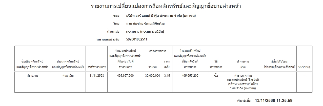 บริษัท อาร์ แอนด์ บี ฟู้ด ซัพพลาย จำกัด (มหาชน) หรือ RBF ตอกย้ำความเชื่อมั่นศักยภาพธุรกิจ ล่าสุบิ๊กบอส “สมชาย รัตนภูมิภิญโญ” ประธานเจ้าหน้าที่บริหาร เข้าซื้อบิ๊กล็อตจากกองทุนต่างประเทศ 30,000,000 หุ้น ในราคาเฉลี่ยหุ้นละ 3.15 บาท คิดเป็นมูลค่ารวม 94.50 ล้านบาท งานนี้สะท้อนถึงความเชื่อมั่นเต็มเปี่ยมต่ออนาคตของ RBF ที่มีศักยภาพเติบโตอย่างต่อเนื่องทั้งในประเทศและต่างประเทศ