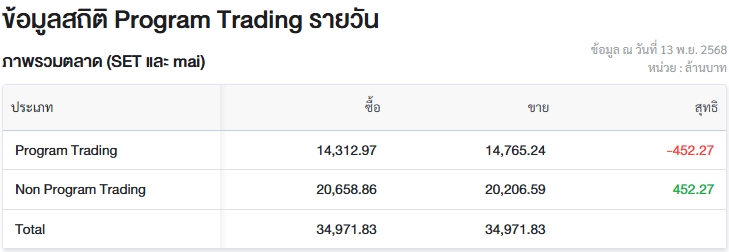 ผู้สื่อข่าวรายงานว่า วันนี้ (13 พ.ย.68) ตลาดหลักทรัพย์แห่งประเทศไทย (ตลท.) เปิดเผยข้อมูลซื้อขายรายวันผ่าน Program Trading หรือ “โปรแกรมโรบอทเทรดดิ้ง” พบว่ามีมูลค่าซื้อจำนวน 14,312.97 ล้านบาท และมูลค่าขายจำนวน 14,765.24 ล้านบาท เท่ากับขายสุทธิ 452.27 ล้านบาท