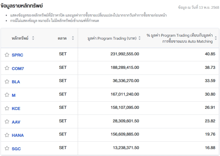 นอกจากนี้ ตลาดหลักทรัพย์แห่งประเทศไทย (ตลท.) รายงานข้อมูลหลักทรัพย์ที่มีการซื้อขายผ่านระบบ Program Trading สูงสุด โดยพิจารณาจากสัดส่วนมูลค่า Program Trading เทียบกับมูลค่าการซื้อขายแบบ Auto Matching พบว่ามี หลักทรัพย์ที่มีการทำรายการสูงสุดในวันนี้ ได้แก่ SPRC, COM7, BLA, M, KCE, AAV, HANA และ SGC