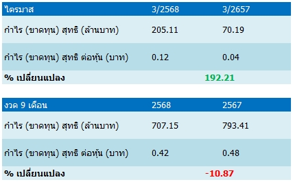 ขณะที่ผลประกอบการงวด 9 เดือนปี 68 มีกำไรสุทธิ 707.15 ล้านบาท ลดลง 10.87% เมื่อเทียบกับงวดเดียวกันของปีก่อนมีกำไรสุทธิ 793.41 ล้านบาท