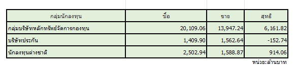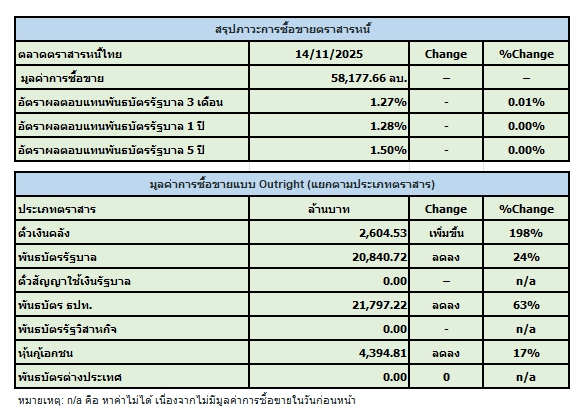 สมาคมตลาดตราสารหนี้ไทย (ThaiBMA) สรุปภาวะตลาดตราสารหนี้ไทยประจำวันนี้ มีมูลค่าการซื้อขายรวมทั้งวันอยู่ที่ 58,178 ล้านบาท ด้านประเภทของนักลงทุน ที่มีมูลค่าการซื้อขายสูงที่สุด 2 อันดับแรก คือ 1. กลุ่มบริษัทหลักทรัพย์จัดการกองทุน (บลจ.) ซื้อสุทธิ 6,162 ล้านบาท 2. กลุ่มบริษัทประกัน ขายสุทธิ 153 ล้านบาท ในขณะที่นักลงทุนต่างชาติ ซื้อสุทธิ 914 ล้านบาท