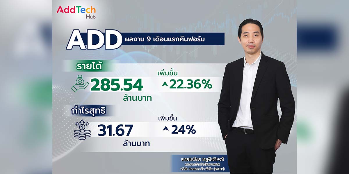 นายสมโภช ทนุตันติวงศ์ ประธานเจ้าหน้าที่ฝ่ายการเงิน บริษัท แอดเทค ฮับ จำกัด (มหาชน) หรือ ADD เปิดเผยว่า ท่ามกลางภาวะเศรษฐกิจไทยที่ยังคงเผชิญความไม่แน่นอน จากปัจจัยด้านนโยบายการค้าโลกและความระมัดระวังในการใช้จ่ายของผู้บริโภค ทาง ADD ได้มีการปรับกลยุทธ์ทางธุรกิจ มุ่งเน้นการขยายธุรกิจไปยังกลุ่มลูกค้าองค์กร (B2B) ผ่านบริการการตลาดดิจิทัล และพัฒนาแพลตฟอร์มโซลูชันที่ใช้ในอุตสาหกรรมอื่นๆ ส่งผลเชิงบวกต่อตัวเลขผลการดำเนินงานในงวดไตรมาส 3/2568 กำไรสุทธิอยู่ที่ 16.70 ล้านบาท เพิ่มขึ้น 71.94% เมื่อเทียบกับงวดเดียวกันของปีก่อนมีกำไรสุทธิ 9.71 ล้านบาท ขณะที่งวด 9 เดือนแรกของปี 2568 มีกำไรสุทธิอยู่ที่ 31.76 ล้านบาท เพิ่มขึ้น 32.55% เมื่อเทียบกับงวดเดียวกันของปีก่อนมีกำไรสุทธิ 23.96 ล้านบาท