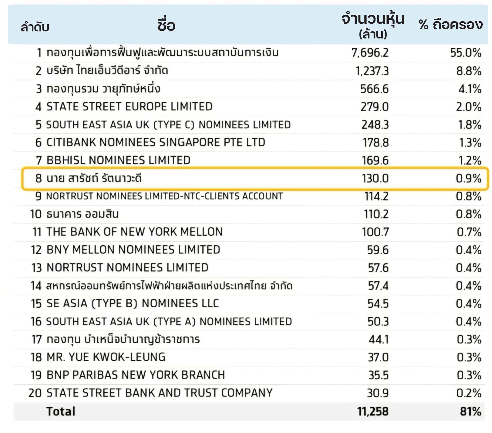 ผู้ถือหุ้นใหญ่รายใหม่ที่เข้ามาได้แก่ ผู้ถือหุ้นอันดับ 7. BBHISL NOMINEE LIMITED ถือหุ้นจำนวน 169.6 ล้านหุ้น คิดเป็นสัดส่วน 1.2% และผู้ถือหุ้นอันดับ 8. นายสารัชถ์ รัตนาวะดี ถือหุ้นจำนวน 130 ล้านบาท คิดเป็นสัดส่วน 0.9%