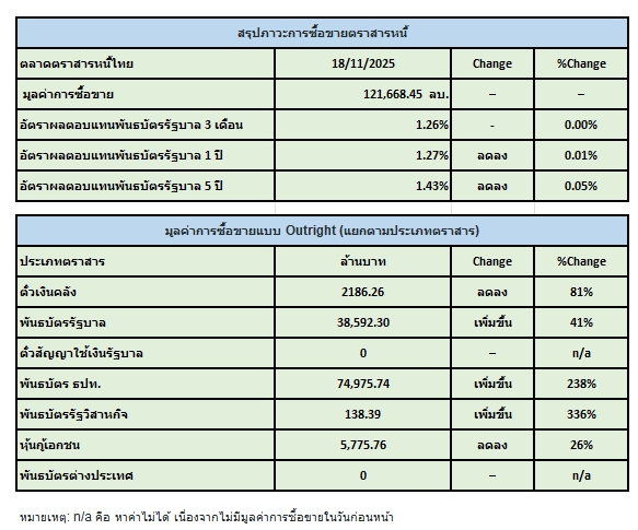 ภาพรวมของตลาดในวันนี้ Yield Curve ปรับตัวลดลงจากวันก่อนหน้าประมาณ 1-5 bps. ในตราสารระยะยาว โดยนักลงทุนคาดการณ์ว่าคณะกรรมการนโยบายการเงิน (กนง.) มีโอกาสปรับลดอัตราดอกเบี้ยลงในการประชุมเดือน ธ.ค.นี้ หลังจากสภาพัฒน์รายงานภาวะเศรษฐกิจไทยประจำไตรมาส 3/68 ขยายตัว 1.2% ชะลอตัวลงจากไตรมาสก่อนหน้า สำหรับกระแสเงินลงทุนของนักลงทุนต่างชาติวันนี้ NET OUTFLOW 2,415 ล้านบาท โดยเกิดจาก NET SELL 2,415 ล้านบาท และไม่มีตราสารหนี้ที่ถือครองโดยนักลงทุนต่างชาติหมดอายุ (Expired)