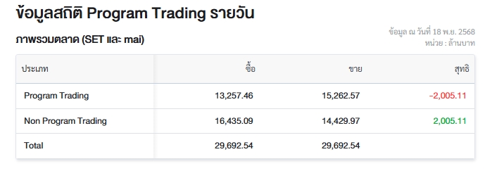 ผู้สื่อข่าวรายงานว่า วันนี้ (18 พ.ย.68) ตลาดหลักทรัพย์แห่งประเทศไทย (ตลท.) เปิดเผยข้อมูลซื้อขายรายวันผ่าน Program Trading หรือ “โปรแกรมโรบอทเทรดดิ้ง” พบว่ามีมูลค่าซื้อจำนวน 13,257.46 ล้านบาท และมูลค่าขายจำนวน 15,262.57 ล้านบาท เท่ากับขายสุทธิ 2,005.11 ล้านบาท