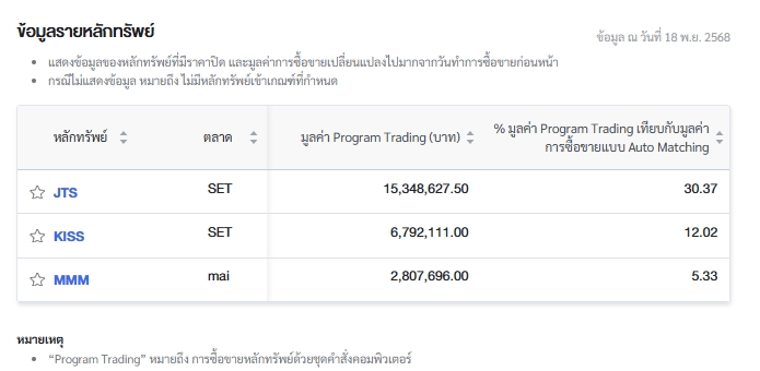 นอกจากนี้ ตลาดหลักทรัพย์แห่งประเทศไทย (ตลท.) รายงานข้อมูลหลักทรัพย์ที่มีการซื้อขายผ่านระบบ Program Trading สูงสุด โดยพิจารณาจากสัดส่วนมูลค่า Program Trading เทียบกับมูลค่าการซื้อขายแบบ Auto Matching พบว่า หลักทรัพย์ที่มีการทำรายการสูงสุดในวันนี้ ได้แก่ JTS ,KISS,MMM