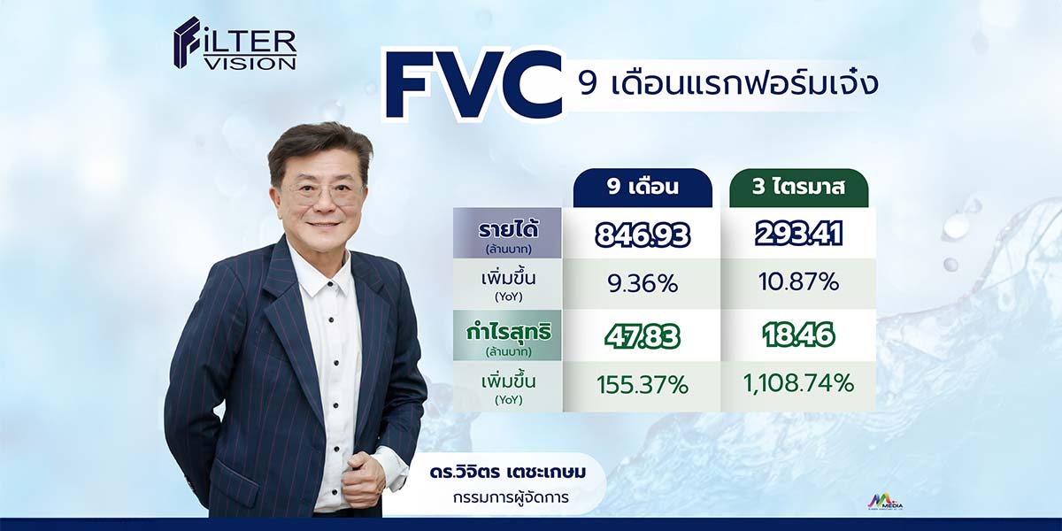 ดร.วิจิตร เตชะเกษม กรรมการผู้จัดการ บริษัท ฟิลเตอร์ วิชั่น จำกัด (มหาชน) หรือ FVC เปิดเผยถึงผลการดำเนินงานงวด 9 เดือนแรกปี 2568 ว่า บริษัทฯ มีกำไรสุทธิ 47.83 ล้านบาท เพิ่มขึ้น 29.10 ล้านบาท คิดเป็นอัตราการเติบโต 155.37% เมื่อเทียบกับช่วงเดียวกันของปีที่ผ่านมา และรายได้จากการขายและบริการอยู่ที่ 846.93 ล้านบาท เพิ่มขึ้น 72.52 ล้านบาท หรือเติบโตเพิ่มขึ้น 9.36% เมื่อเทียบกับช่วงปีก่อน