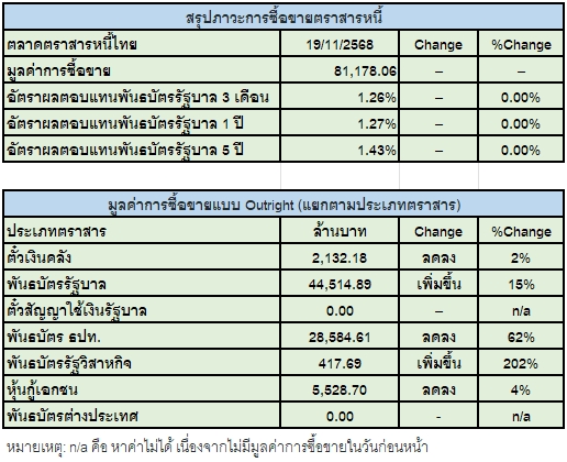 สมาคมตลาดตราสารหนี้ไทย (ThaiBMA) สรุปภาวะตลาดตราสารหนี้ไทยประจำวันนี้มีมูลค่าการซื้อขายรวมทั้งวันอยู่ที่ 81,178 ล้านบาท ด้านประเภทของนักลงทุน ที่มีมูลค่าการซื้อขายสูงที่สุด 2 อันดับแรก คือ 1. กลุ่มบริษัทหลักทรัพย์จัดการกองทุน (บลจ.) ซื้อสุทธิ 4,665 ล้านบาท 2. กลุ่มบริษัทประกัน ซื้อสุทธิ 1,405 ล้านบาท ในขณะที่นักลงทุนต่างชาติ ซื้อสุทธิ 2,501 ล้านบาท Yield พันธบัตรอายุ 5 ปี ปิดที่ 1.43% ไม่มีการเปลี่ยนแปลงจากเมื่อวาน