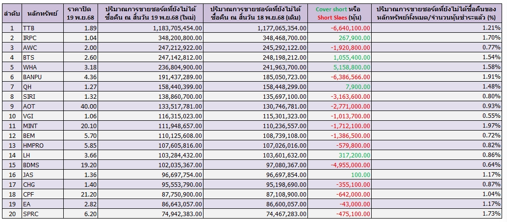 เปิด 20 อันดับหุ้นถูก “Cover-Short” สูงสุด ณ 19 พ.ย.68