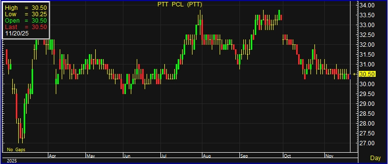 ผู้สื่อข่าวรายงานว่า วันนี้ (20 พ.ย.68) ราคาหุ้น บริษัท ปตท. จำกัด (มหาชน) หรือ PTT ณ เวลา 10:15 น. อยู่ที่ระดับ 30.50 บาท บวก 0.25 บาท หรือ 0.83% สูงสุดที่ระดับ 30.50 บาท ต่ำสุดที่ระดับ 30.25 บาท ด้วยมูลค่าการซื้อขาย 18.50 ล้านบาท