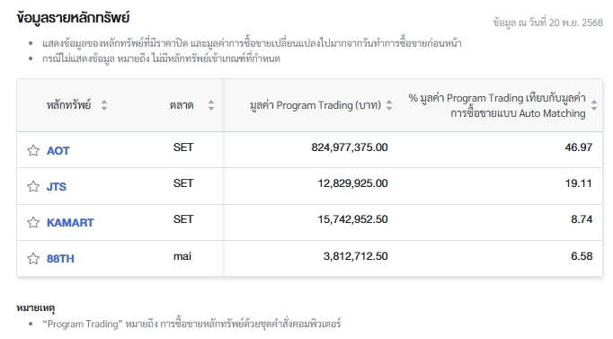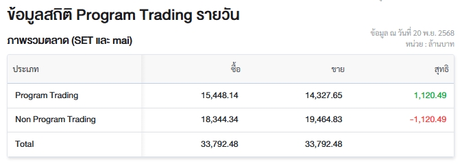 ผู้สื่อข่าวรายงานว่า วันนี้ (20 พ.ย.68) ตลาดหลักทรัพย์แห่งประเทศไทย (ตลท.) เปิดเผยข้อมูลซื้อขายรายวันผ่าน Program Trading หรือ “โปรแกรมโรบอทเทรดดิ้ง” พบว่ามีมูลค่าซื้อจำนวน ล้านบาท และมูลค่าขายจำนวน ล้านบาท เท่ากับขายสุทธิ ล้านบาท