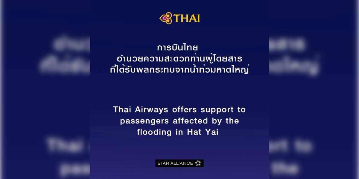 บริษัท การบินไทย จำกัด (มหาชน) หรือ THAI ขอแจ้งการอำนวยความสะดวกสำหรับท่านผู้โดยสารที่ได้รับผลกระทบจากสถานการณ์น้ำท่วมในพื้นที่อำเภอหาดใหญ่ จังหวัดสงขลา สำหรับท่านที่ถือบัตรโดยสารของการบินไทยซึ่งออกก่อนหรือภายในวันที่ 22 พฤศจิกายน 2568 และมีแผนเดินทางเข้า–ออกท่าอากาศยานหาดใหญ่ ระหว่างวันที่ 22–30 พฤศจิกายน 2568 สามารถดำเนินการได้ดังนี้