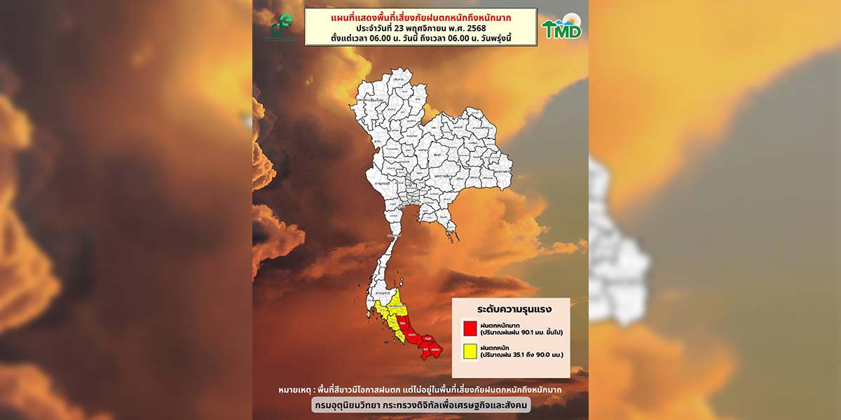 ด้านภาคใต้ตอนล่างยังคงมีฝนตกหนักถึงหนักมากในหลายพื้นที่ โดยเฉพาะจังหวัดนครศรีธรรมราช พัทลุง สงขลา ปัตตานี ยะลา นราธิวาส ตรัง และสตูล จากอิทธิพลของหย่อมความกดอากาศต่ำที่ปกคลุมทะเลอันดามันตอนล่างและประเทศมาเลเซีย ประกอบกับมรสุมตะวันออกเฉียงเหนือที่ยังคงมีกำลังค่อนข้างแรง ส่งผลให้เสี่ยงน้ำท่วมฉับพลัน น้ำป่าไหลหลาก และน้ำล้นตลิ่ง โดยเฉพาะพื้นที่ลาดเชิงเขา พื้นที่ใกล้ทางน้ำไหลผ่าน และพื้นที่ลุ่มต่ำ