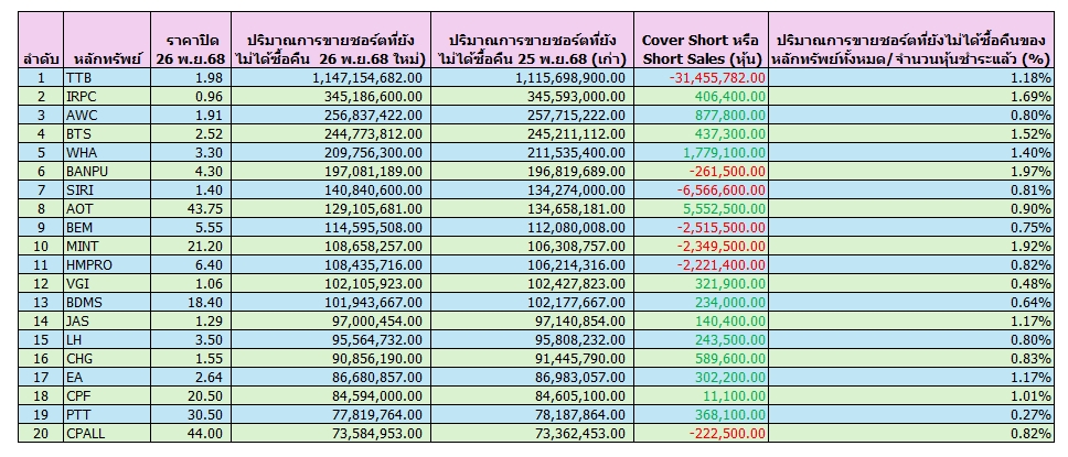 ข้อมูลสิ้นสุด 26 พ.ย.68 พบ TTB มีปริมาณชอร์ตคงค้างเหลือมากสุด 1,147 ล้านหุ้น คิดเป็น 1.18% และถูก Short Sales สูงสุด 31 ล้านหุ้น ด้าน AOT ถูก Cover Short สูงสุด 5.5 ล้านหุ้น