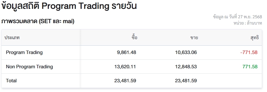 ผู้สื่อข่าวรายงานว่า วันนี้ (27 พ.ย.68) ตลาดหลักทรัพย์แห่งประเทศไทย (ตลท.) เปิดเผยข้อมูลซื้อขายรายวันผ่าน Program Trading หรือ “โปรแกรมโรบอทเทรดดิ้ง” พบว่ามีมูลค่าซื้อจำนวน 9,861.48 ล้านบาท และมูลค่าขายจำนวน 10,633.06 ล้านบาท เท่ากับขายสุทธิ 771.58 ล้านบาท