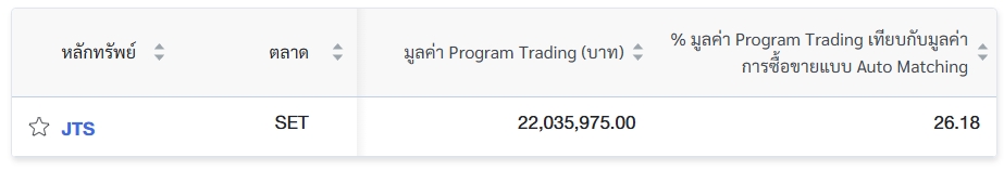 โดย บริษัท จัสมิน เทคโนโลยี โซลูชั่น จำกัด (มหาชน) หรือ JTS มีมูลค่าการซื้อขายผ่าน Program Trading จำนวน 22.03 ล้านบาท คิดเป็น 26.18% ของมูลค่าการซื้อขายแบบ Auto Matching ซึ่งอยู่ที่ 84.17 ล้านบาท