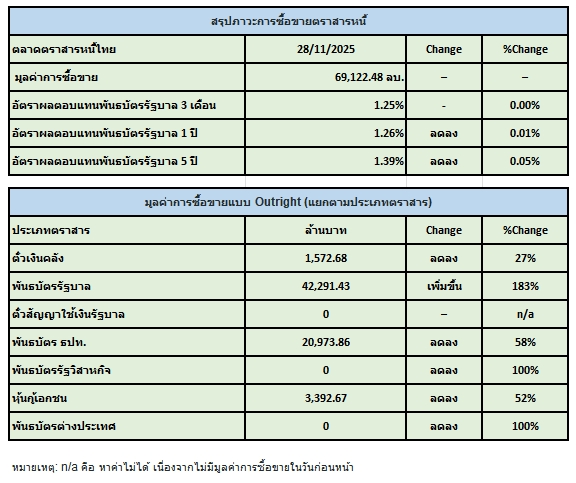 โดยภาพรวมของตลาดในวันนี้ Yield Curve ปรับตัวเพิ่มขึ้นจากวันก่อนหน้าประมาณ 1-2 bps. ในตราสารระยะยาว สำหรับกระแสเงินลงทุนของนักลงทุนต่างชาติวันนี้ NET INFLOW 10,414 ล้านบาท โดยเกิดจาก NET BUY 10,414 ล้านบาท และไม่มีตราสารหนี้ที่ถือครองโดยนักลงทุนต่างชาติหมดอายุ (Expired) ส่วนใหญ่เป็นการซื้อในตราสารระยะยาว ด้านปัจจัยต่างประเทศ รายงานดัชนีราคาผู้บริโภคพื้นฐาน (Core CPI) ของญี่ปุ่นประจำเดือน พ.ย. เพิ่มขึ้น 2.8%(YoY) สูงกว่าที่นักวิเคราะห์คาดการณ์ว่าจะเพิ่มขึ้น 2.7%  สำหรับ Holding ของนักลงทุนต่างชาติ ณ สิ้นสัปดาห์นี้ปรับเพิ่มขึ้น 9,185 ล้านบาท จาก 918,965 ล้านบาท ในสัปดาห์ก่อนหน้าเป็น 928,150 ล้านบาท ทั้งนี้ตลาดติดตามรายงานดัชนีผู้จัดการฝ่ายจัดซื้อ (PMI) ภาคการผลิตและบริการของจีน อียู และสหรัฐฯ ประจำเดือน พ.ย. ในสัปดาห์หน้า