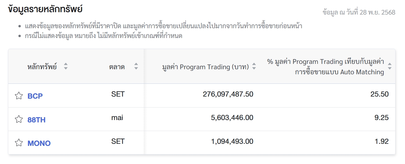 นอกจากนี้ ตลาดหลักทรัพย์แห่งประเทศไทย (ตลท.) รายงานข้อมูลหลักทรัพย์ที่มีการซื้อขายผ่านระบบ Program Trading สูงสุด โดยพิจารณาจากสัดส่วนมูลค่า Program Trading เทียบกับมูลค่าการซื้อขายแบบ Auto Matching พบว่ามี หลักทรัพย์ที่มีการทำรายการสูงสุดในวันนี้ ได้แก่ BCP, 88TH, MONO