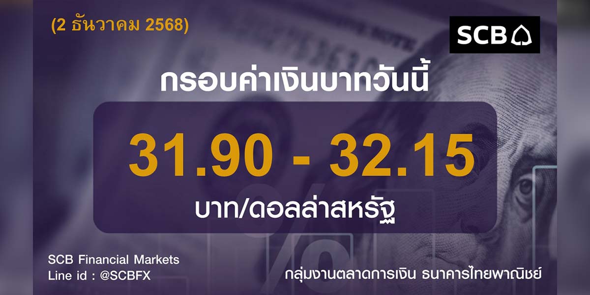 กลุ่มงานตลาดการเงิน ธนาคารไทยพาณิชย์ (SCB Financial Markets) ประเมินค่าเงินบาทวันนี้เคลื่อนไหวในกรอบ 31.90-32.15 บาท/ดอลลาร์