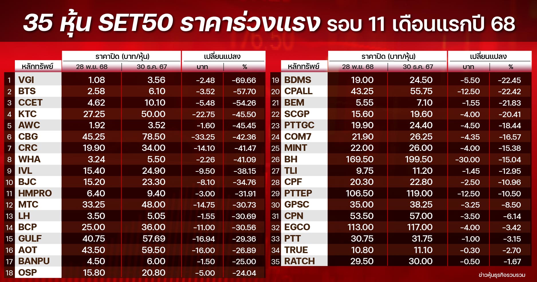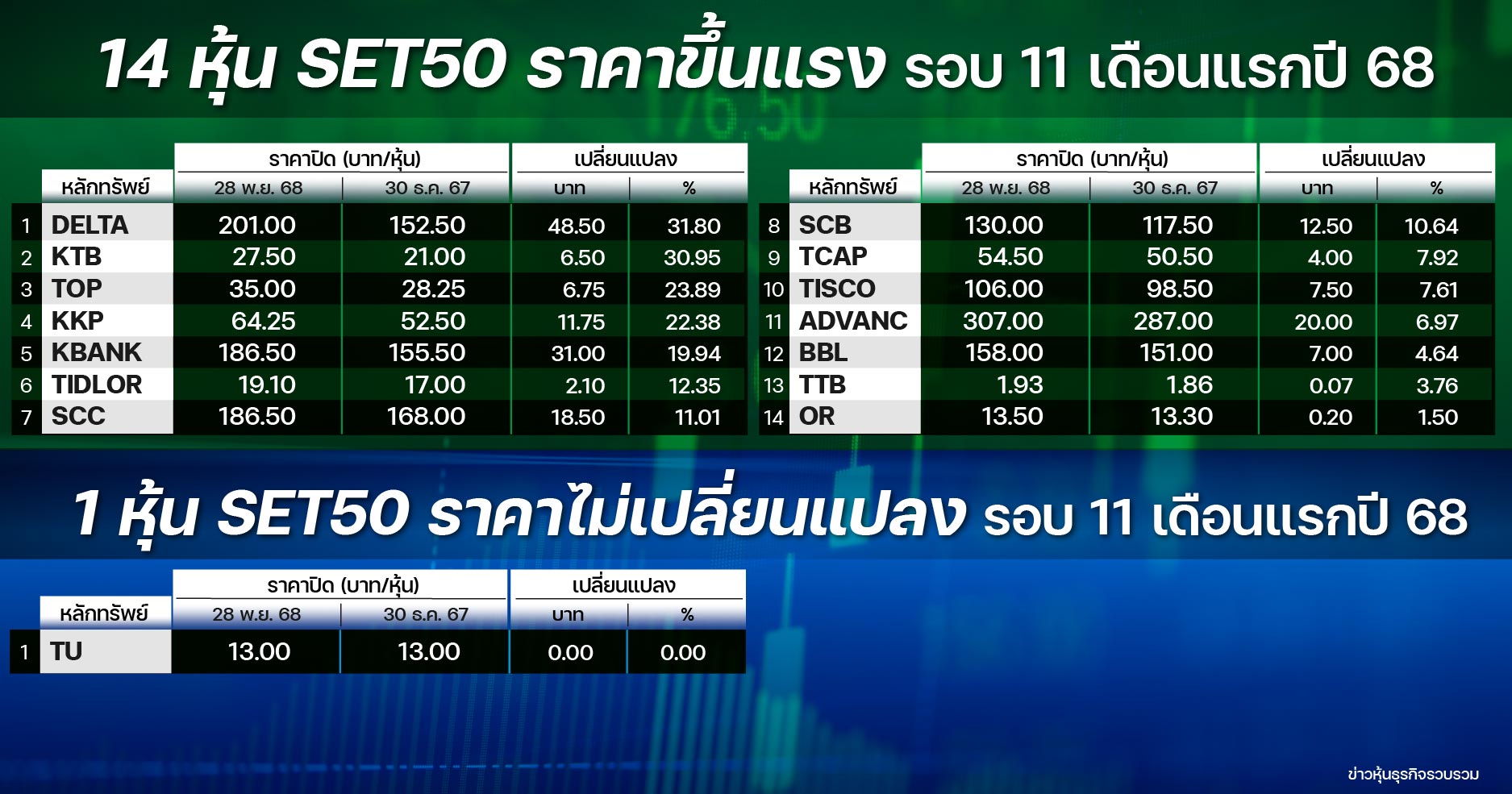 เปิดหุ้นกลุ่ม SET50 “ขึ้นแรง-ร่วงหนัก” รอบ 11 เดือนปี 68