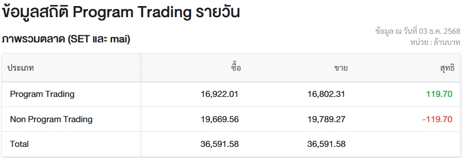 ผู้สื่อข่าวรายงานว่า วันนี้ (2 ธ.ค.68) ตลาดหลักทรัพย์แห่งประเทศไทย (ตลท.) เปิดเผยข้อมูลซื้อขายรายวันผ่าน Program Trading หรือ โปรแกรมโรบอทเทรดดิ้ง” พบว่ามีมูลค่าซื้อจำนวน 16,922.01 ล้านบาท และมูลค่าขายจำนวน 16,802.31 ล้านบาท เท่ากับซื้อสุทธิ 119.70 ล้านบาท