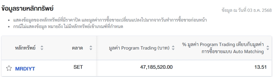 โดย บริษัท มิสเตอร์. ดี.ไอ.วาย. โฮลดิ้ง (ประเทศไทย) จำกัด (มหาชน) หรือ MRDIYT มีมูลค่าการซื้อขายผ่าน Program Trading จำนวน 47.19 ล้านบาท คิดเป็น 13.51% ของมูลค่าการซื้อขายแบบ Auto Matching ซึ่งอยู่ที่ 349.16 ล้านบาท