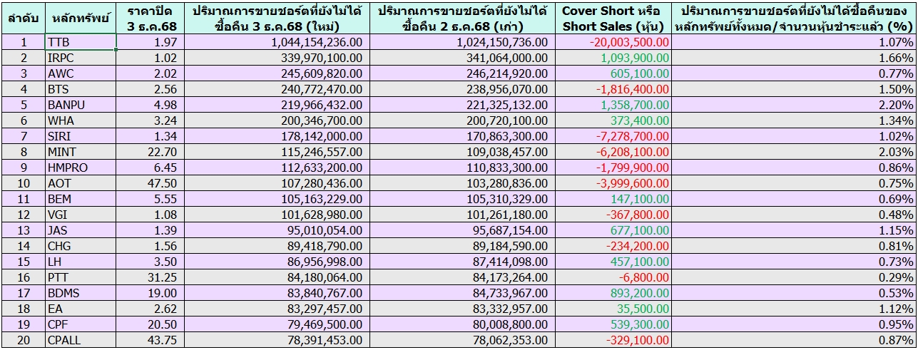 ข้อมูลสิ้นสุด 3 ธ.ค.68 พบ TTB มีปริมาณชอร์ตคงค้างเหลือมากสุด 1,044 ล้านหุ้น คิดเป็น 1.07% และถูก Short Sales สูงสุด 20 ล้านหุ้น ด้าน BANPU ถูก Cover Short สูงสุด 1 ล้านหุ้น