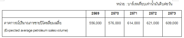 จากแผนงานดังกล่าว ปตท.สผ. ได้คาดการณ์ปริมาณการขายปิโตรเลียมเฉลี่ยต่อวัน (Expected average sales volume) จากโครงการปัจจุบัน ระหว่างปี 2569 – 2573 ดังรายละเอียดต่อไปนี้หน่วย : บาร์เรลเทียบเท่าน้ำมันดิบต่อวัน