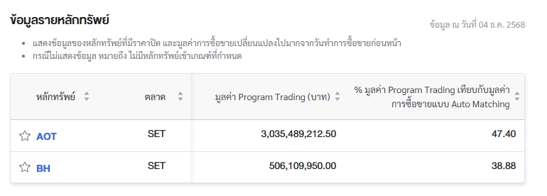 นอกจากนี้ ตลาดหลักทรัพย์แห่งประเทศไทย (ตลท.) รายงานข้อมูลหลักทรัพย์ที่มีการซื้อขายผ่านระบบ Program Trading สูงสุด โดยพิจารณาจากสัดส่วนมูลค่า Program Trading เทียบกับมูลค่าการซื้อขายแบบ Auto Matching พบว่า หลักทรัพย์ที่มีการทำรายการสูงสุดในวันนี้ ได้แก่
