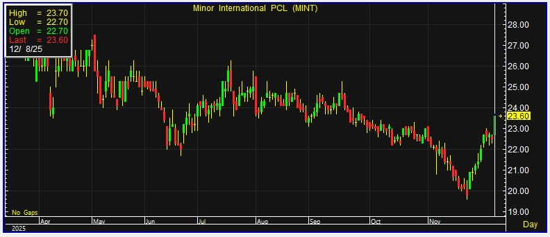 ผู้สื่อข่าวรายงานว่า วัน (8 ธ.ค.68) ราคาหุ้นบริษัท ไมเนอร์ อินเตอร์เนชั่นแนล จํากัด (มหาชน) หรือ MINT ณ เวลา 11:34 น. อยู่ที่ระดับ 23.60 บาท บวก 1.10 บาท หรือ 4.89% ราคาสูงสุด 23.80 บาท ราคาต่ำสุด 22.70 บาท ด้วยมูลค่าซื้อขาย 400.28 ล้านบาท