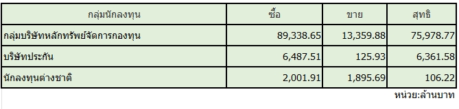 สมาคมตลาดตราสารหนี้ไทย (ThaiBMA) สรุปภาวะตลาดตราสารหนี้ไทยประจำวันนี้ มีมูลค่าการซื้อขายรวมทั้งวันอยู่ที่ 151,800 ล้านบาท ด้านประเภทของนักลงทุน ที่มีมูลค่าการซื้อขายสูงที่สุด 2 อันดับแรก คือ 1. กลุ่มบริษัทหลักทรัพย์จัดการกองทุน (บลจ.) ซื้อสุทธิ 75,979 ล้านบาท กลุ่มบริษัทประกัน ซื้อสุทธิ 6,362 ล้านบาท ในขณะที่นักลงทุนต่างชาติ ซื้อสุทธิ 106 ล้านบาท